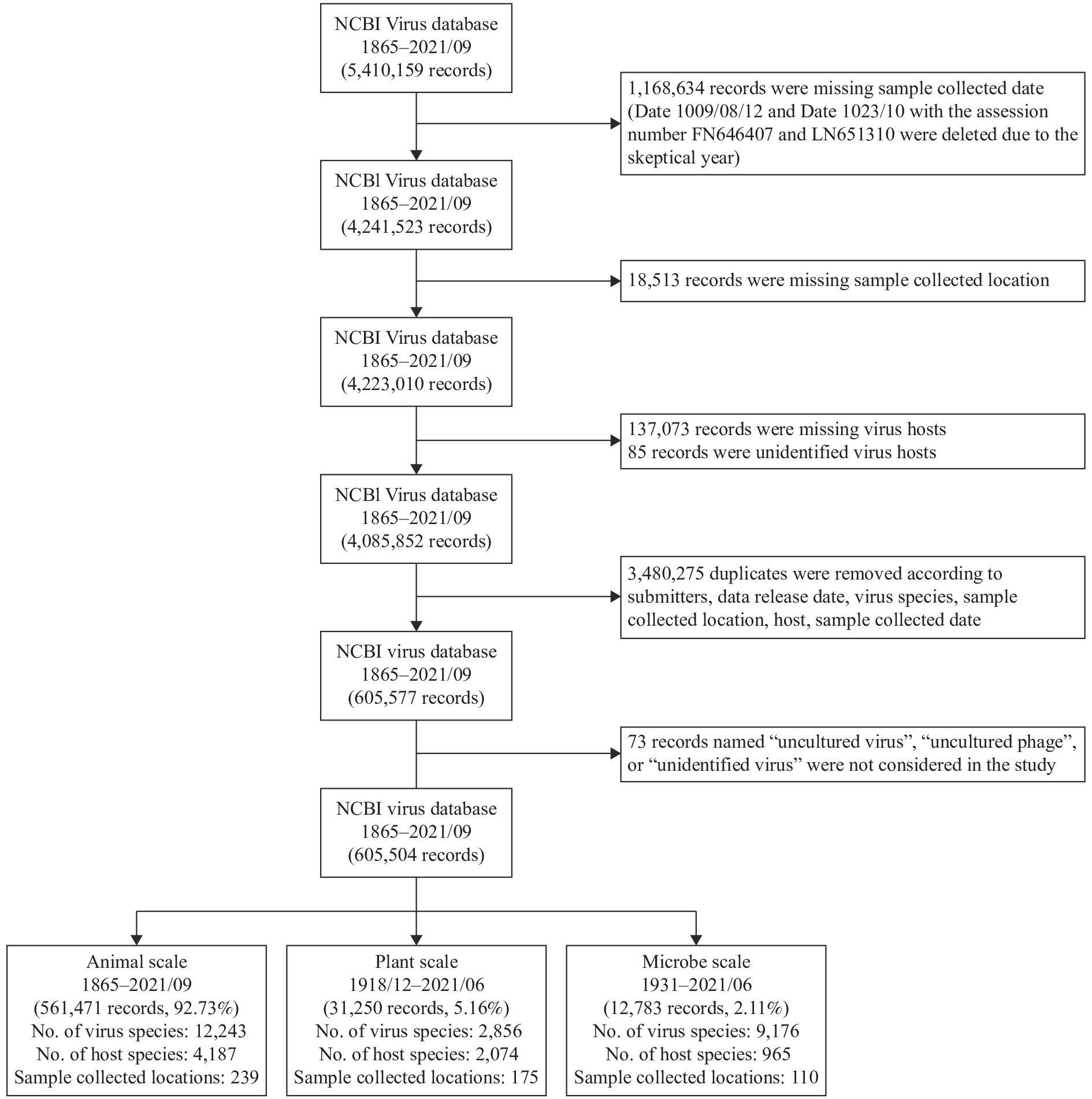 The data were downloaded from the NCBI Virus database and covered available data up to September 2021 ( www.ncbi.nlm.nih.gov/labs/virus ). The data included virus genomic sequence submission information (accession number, submitter, and release date), virus types (species, genus, and family), and biological sample description (location, organisms of sample, isolation, and collection date). Data that were duplicated, missing, or had unidentified collected dates, locations, or organisms of the biological samples were excluded. Because the NCBI only reported that the virus was isolated from an organism, not whether the organism was the host of the virus, we referred to the organisms as suspected hosts. Based on the standard of NCBI taxonomy, suspected hosts were classified into animals, plants, and microbes.