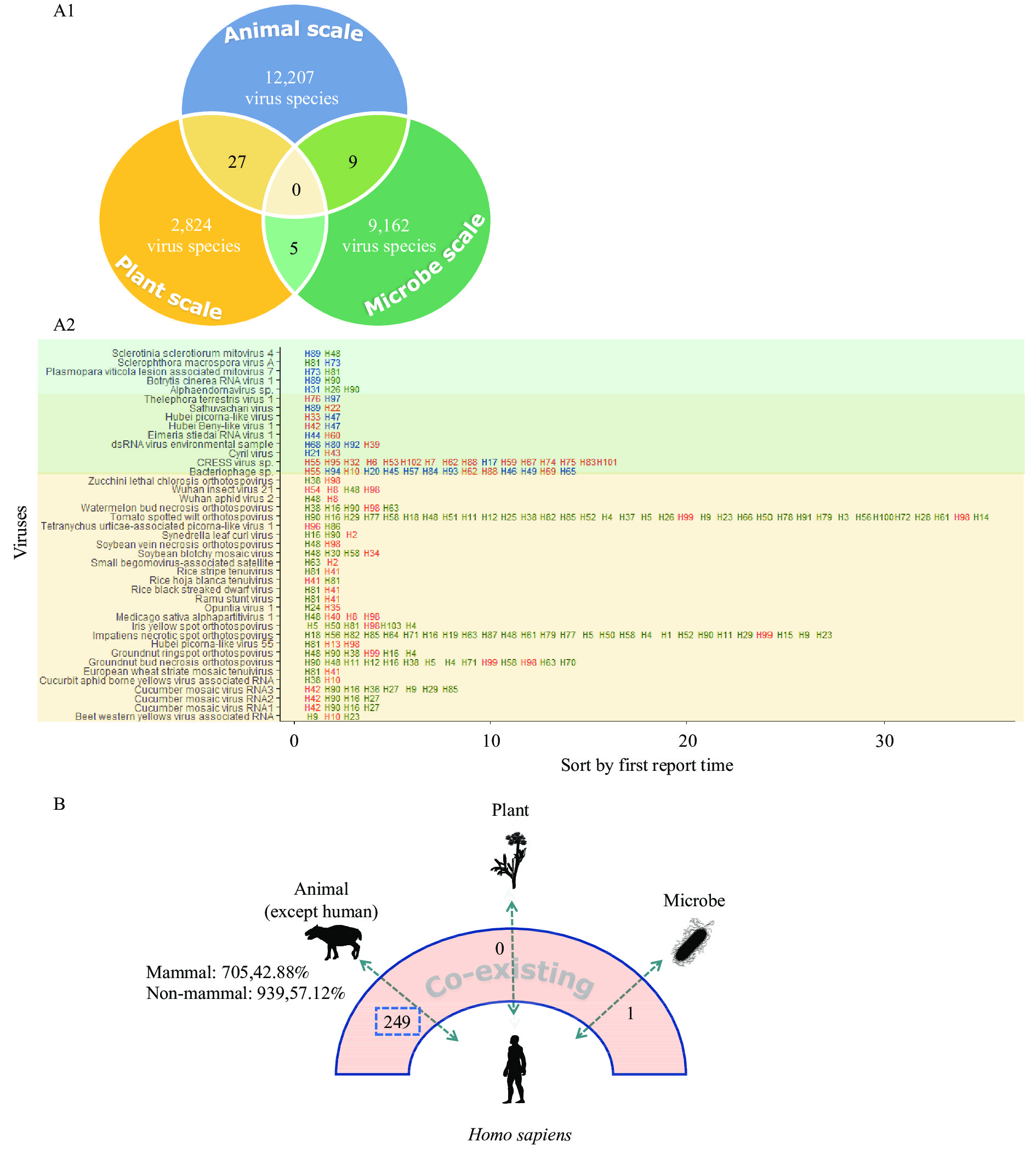 FIGURE 2.Coexisting virus species among animals, plants, and microbes. (A1) The number and intersection of virus species reported from NCBI Virus Database between 1865 and 2021/9. (A2) First reported host family sorted by first report time among coexisting virus species; (B) Coexisting virus species betweenHomo sapiensand animals, plants, or microbes.