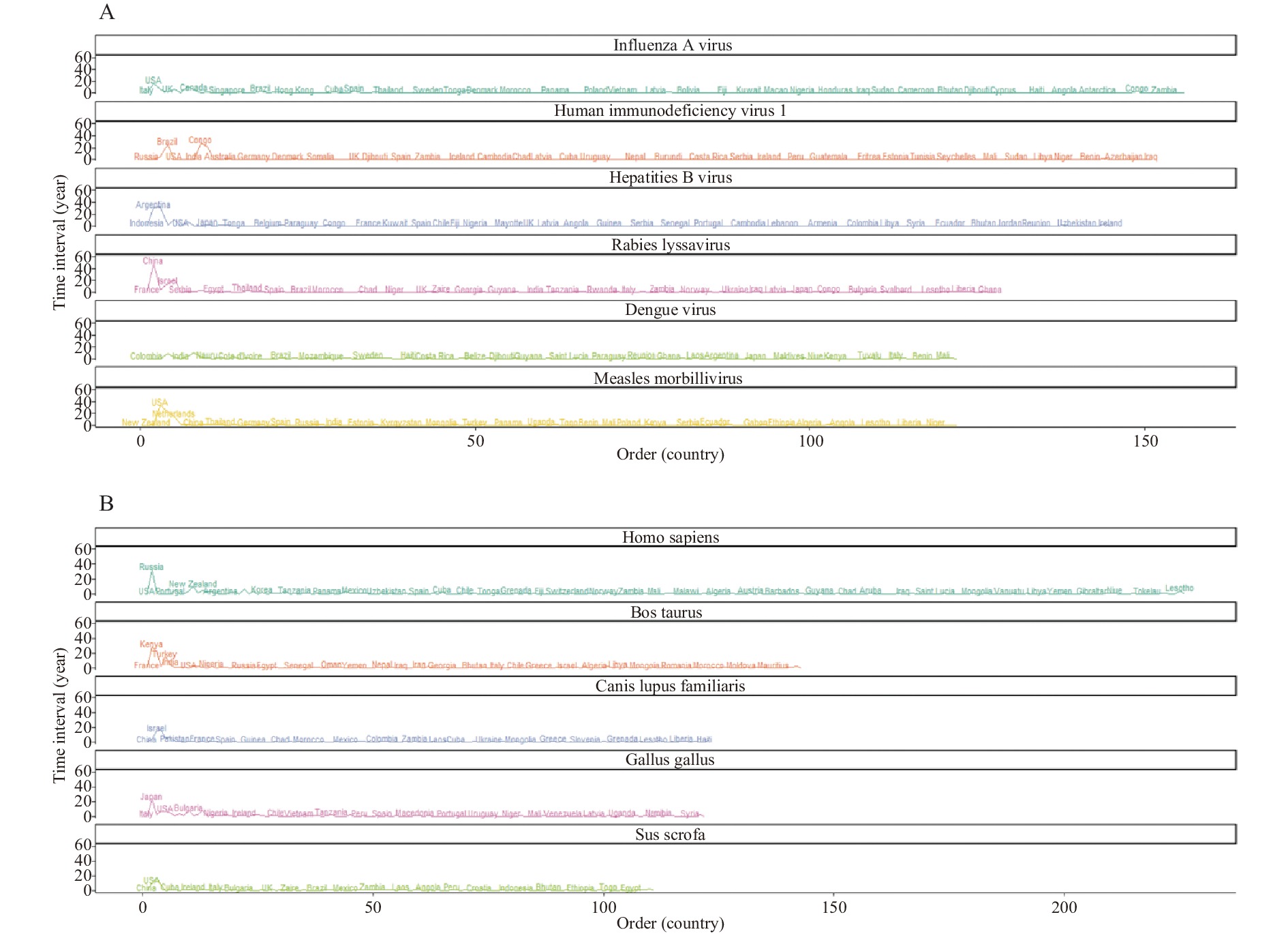 This study was subject to some limitations. First, NCBI is a public database, and the data quality may be uneven. However, NCBI has a form for submitted data, which guarantees that the basic information of submitted data is consistent at some level, and these data can meet the requirements of our spatiotemporal analysis. Second, we classified viruses and suspected hosts according to their submitted names. It will be regarded as two different viruses or suspected hosts if their names are spelled differently. For example,Enterovirus A,Enterovirus B,Enterovirus C, andEnterovirussp.are regarded as different viruses in this study. This might be a slight overestimation of the virus species and suspected hosts submitted in the NCBI database but cannot change their whole spatiotemporal distribution, especially in the long history of their evolution. Further, we identified 249 zoonotic viruses in NCBI, which was consistent with the figure published by the WHO (2). Third, data reported by countries may not be complete, which could lead to bias in the analysis. Also, the advent of next generation sequencing (NGS) would cause bias on the temporal discovery of viruses because it was hard to perform large-scale genome sequencing of viruses before NGS became relatively affordable. Fourth, we did not analyze the path of each virus and their suspected hosts. Analysis of the overlap of viruses and their hosts is important for predicting the risk of a new virus outbreak in local areas, but beyond the scope of this study.