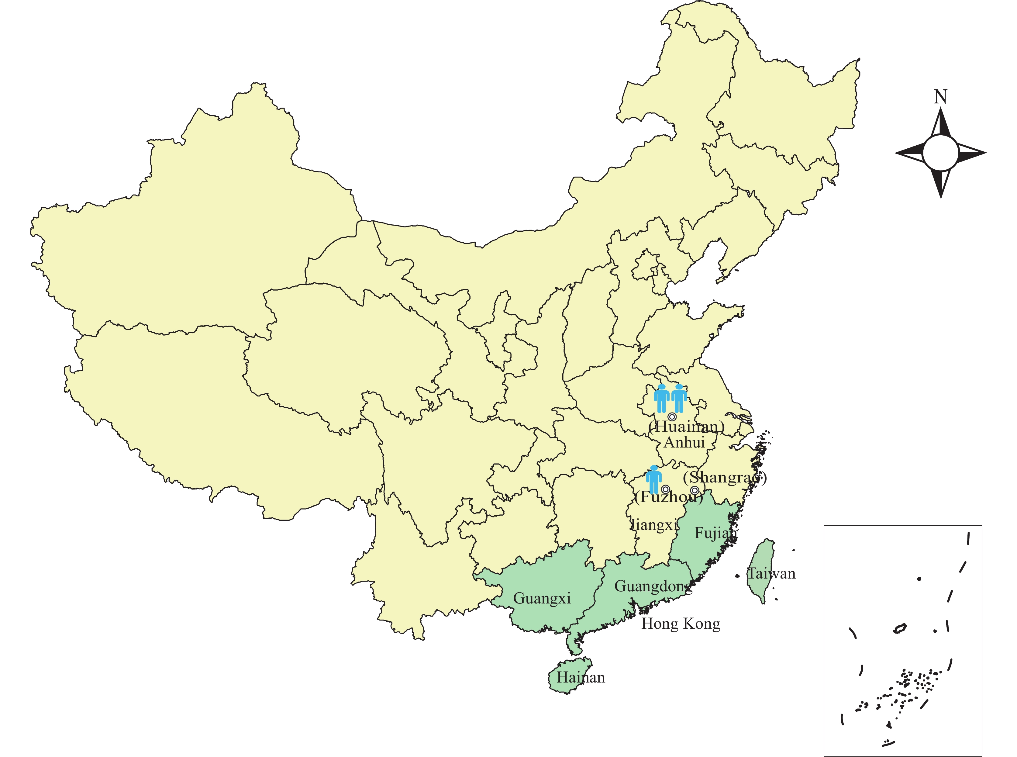 • FIGURE 1.Geographic distribution of the three melioidosis cases in Anhui and Jiangxi Provinces, China, 2021.