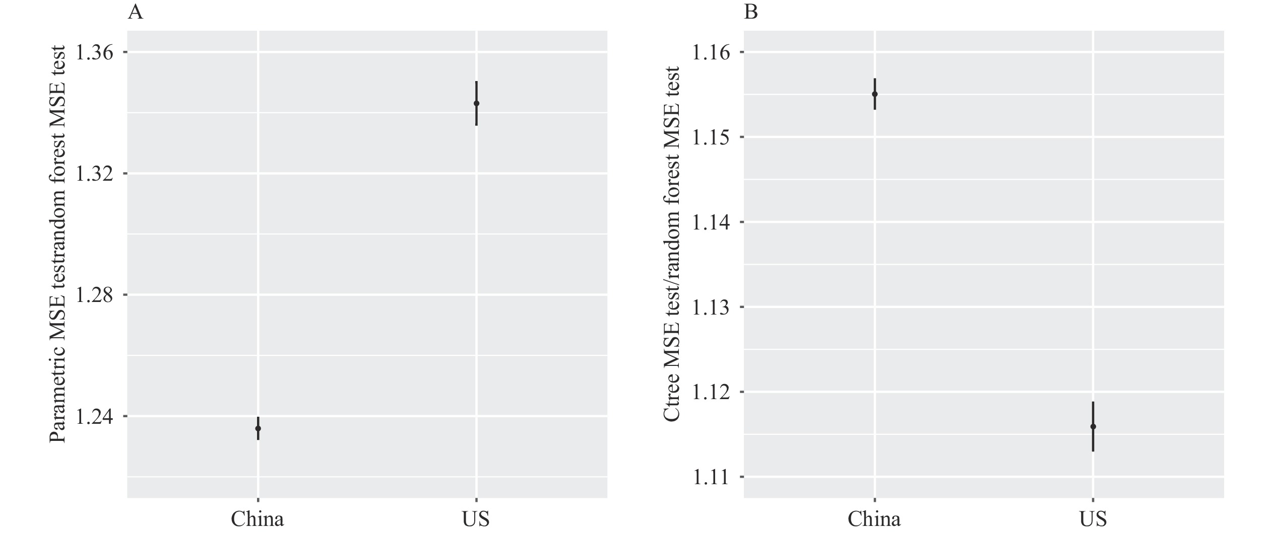 Figure 3Areveals that in China, using conditional inference forest, the key factors impacting self-rated health are childhood health and being born in the eastern China, which corroborates findings from the conditional inference trees (Figure 2A). Additionally, parents’ health status (staying in bed for a long time) and relationship with parents also have a high impact on self-rated health in older ages. Similarly,Figure 3Bdemonstrates that in the US, childhood health, number of books at home at age 10, and race/ethnicity are significant factors, which largely align with results obtained through conditional inference trees (Figure 2B).