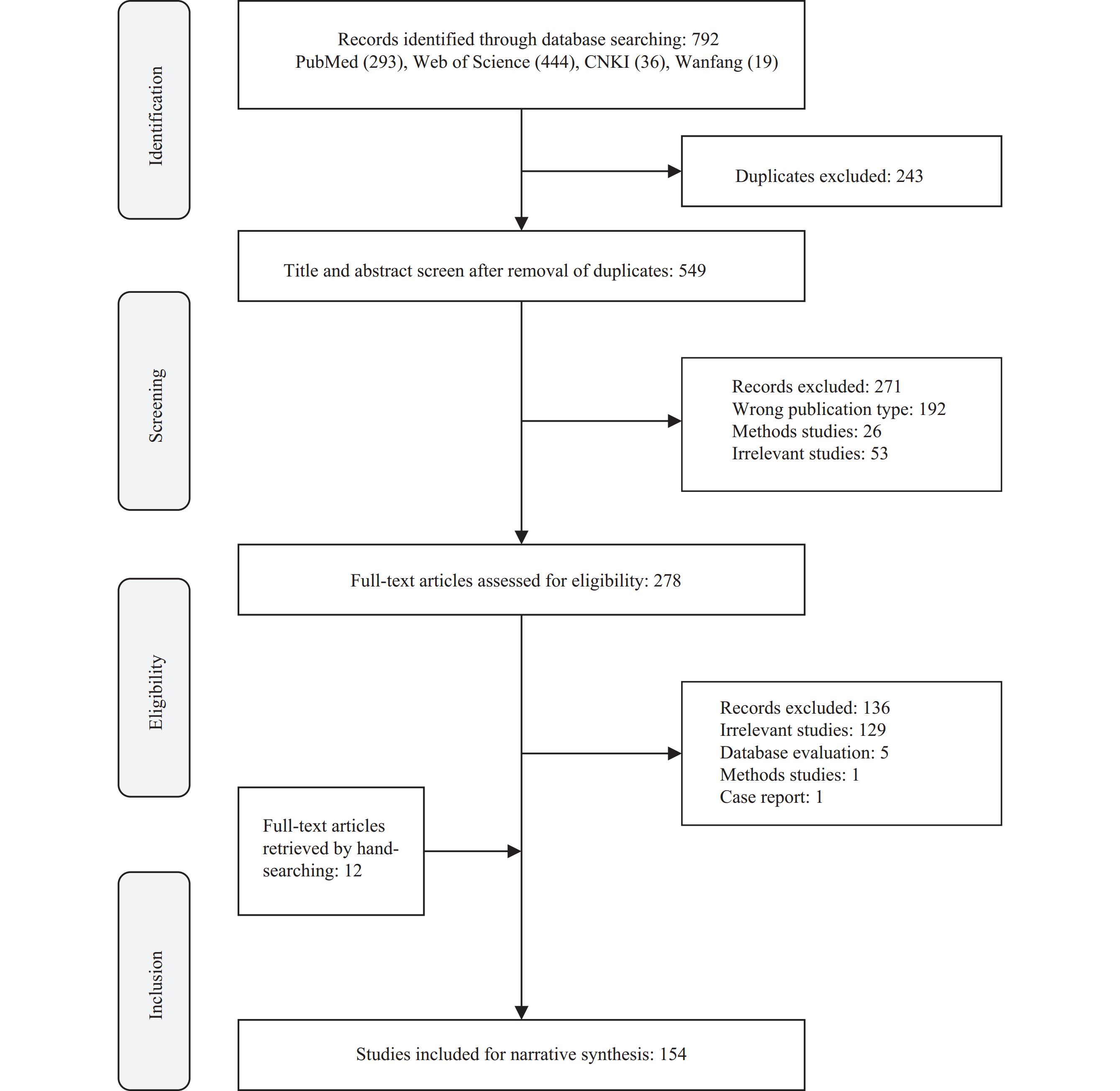 The initial search found 792 articles, with 243 duplicates removed. After excluding 271 articles based on title and abstract review, 278 articles underwent full-text screening. Additionally, 12 articles were identified through reference list review and manual search. Ultimately, 154 articles were included in the synthesis (Figure 1).
