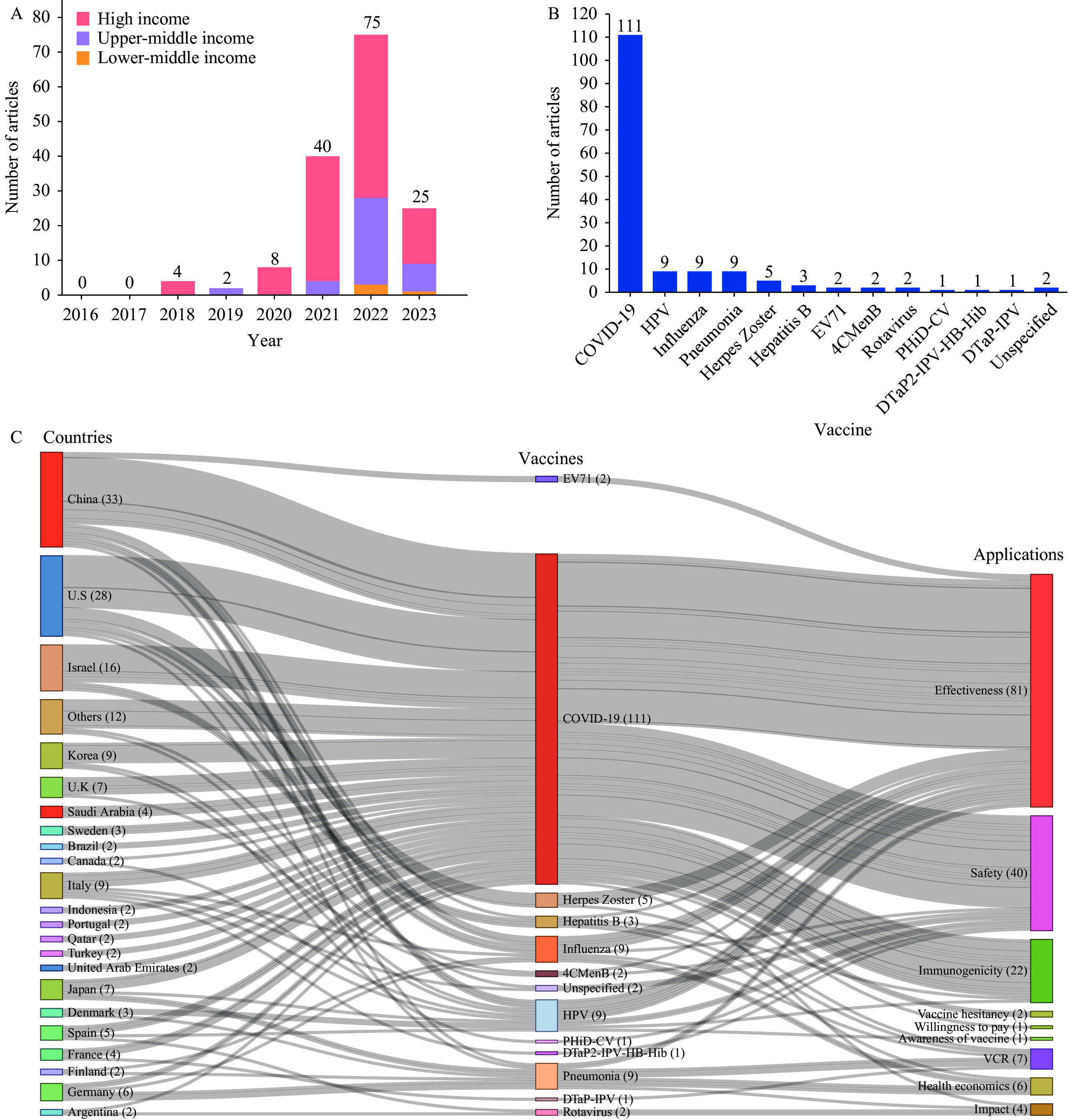 The figure inFigure 2Aillustrates the publication trend of studies that mentioned keywords related to RWD/RWE/RWS from December 2016 to July 2023. The number of publications notably increased annually, peaking at 75 studies in 2022. Among the 154 articles, 111 were from high-income countries or regions, according to the World Bank Development Indicators (https://www.worldbank.org). The most researched vaccine, with 111 studies, was the coronavirus disease 2019 (COVID-19) vaccine, followed by the HPV vaccine, the influenza vaccine, and the pneumonia vaccine, each with 9 studies (Figure 2B).Figure 2Cshows that the studies covered 34 countries, with China leading in the number of vaccine-related real-world studies (33 studies), followed by the United States (28 studies). The primary uses of real-world studies were to assess effectiveness (81 studies), safety (40 studies), and immunogenicity (22 studies). Additionally, two studies on the EV71 vaccine were exclusively conducted in China. Real-world studies were also applied to evaluate vaccine coverage rates, health economics, impact, vaccine hesitancy, willingness to pay, and awareness of vaccine evaluations.