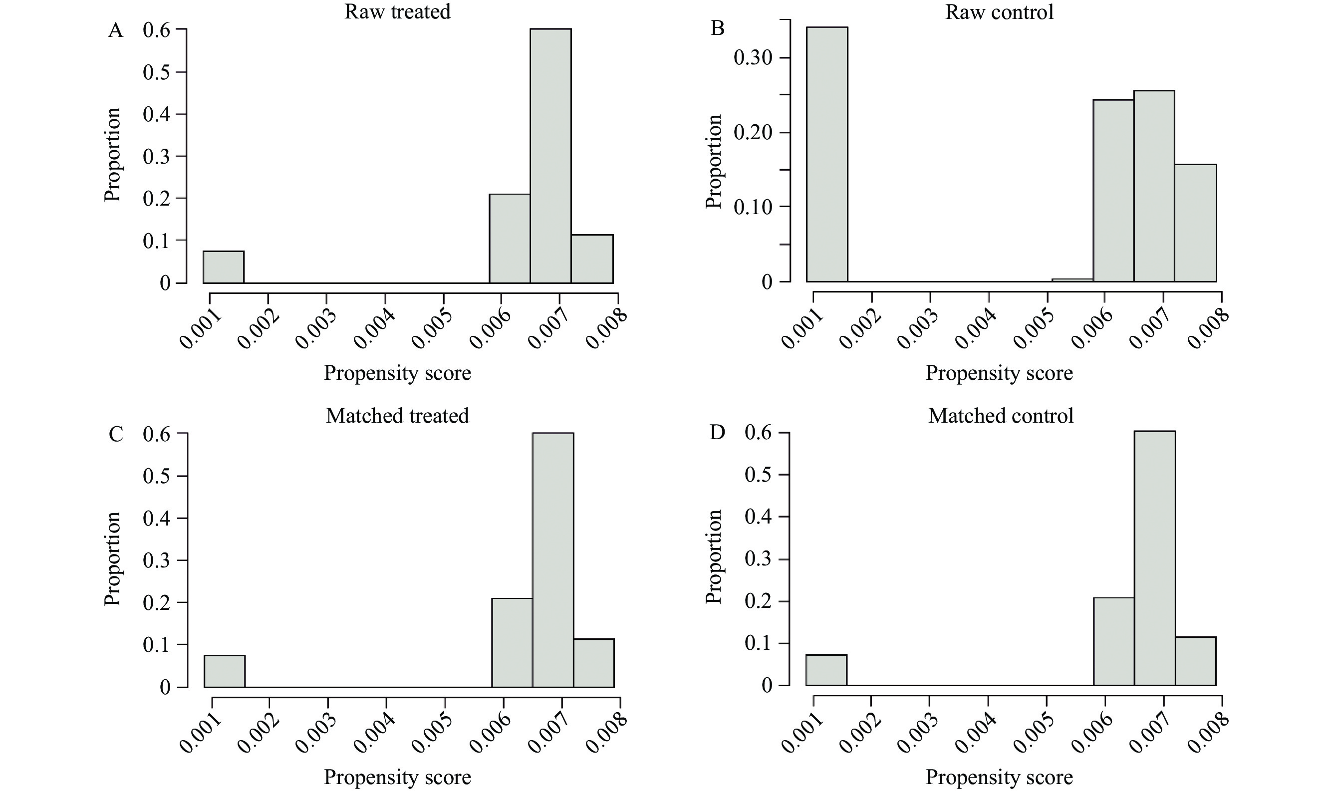 Figure 1.Comparison of propensity scores between TB/HIV and HIV-negative TB patients before and after PSM in Shanghai Municipality, China, 2021–2023. (A) TB/HIV before PSM; (B) HIV-negative TB patients before PSM; (C) TB/HIV after PSM; (D) HIV-negative TB patients after PSM.