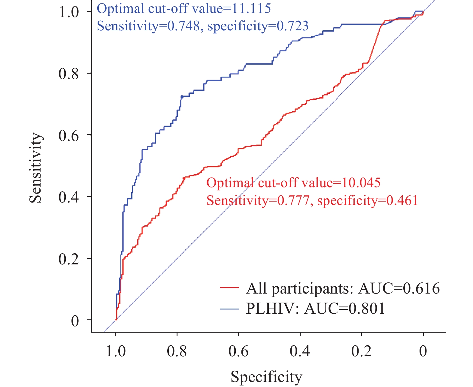 Abbreviation: ROC=receiver operating characteristic; CRP=C-reactive protein; TB=tuberculosis; HIV=human immunodeficiency virus; PLHIV=people living with HIV.For PLHIV, at a CRP threshold of >5 mg/L, the sensitivity was 80.85% and the specificity was 58.51%. At a CRP threshold of >10 mg/L, the sensitivity was 72.23% and the specificity was 77.66%. For all participants, the sensitivity decreased to 55.09% (CRP>5 mg/L) and 45.19% (CRP>10 mg/L), while the specificity remained unchanged.
