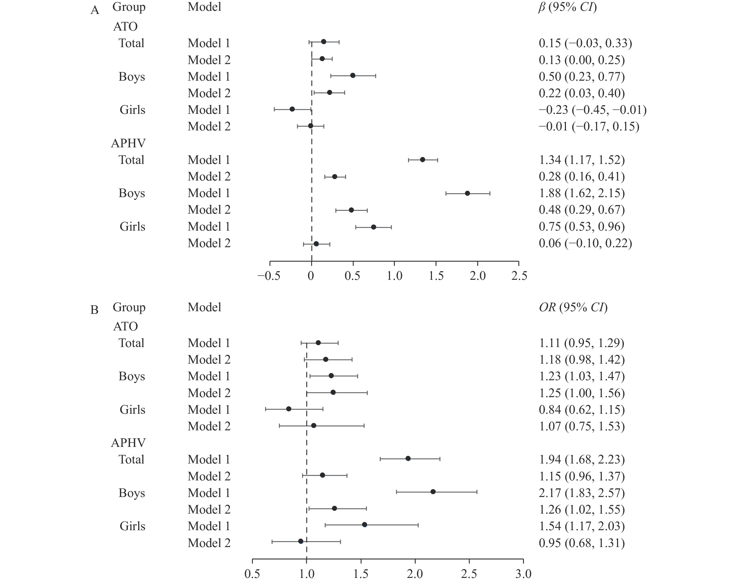 Categorical variables are presented as numbers and percentages, while continuous variables are reported as mean±standard deviation. In this study,t-tests and chi-square tests were used to compare differences between groups. We established initial participation in the HPPCA at 6–8 years of age as the baseline during 2012–2014 and designated the final measurement at 15–17 years of age (late adolescence) in 2020 as the endpoint. Linear and logistic regression models were used to analyze the associations of ATO and APHV with BMI levels and risks of obesity in late adolescence. We also analyzed the risks of elevated BMI levels and obesity in late adolescence for participants in the early group compared to the non-early group. Coefficients (β), odds ratios (ORs), and 95% confidence intervals (CIs) for the unadjusted model (Model 1) and the adjusted model (Model 2, adjusted for sex, area, age, and baseline BMI) were reported. The fitting of ATO and APHV was performed in Stata Statistical Software (version 16, Stata Corp., TX, USA) using the “pbreg” package. SPSS Statistics (version 22, IBM SPSS Inc., Chicago, IL, USA) was used for other analyses. AP-value of less than 0.05 was considered statistically significant.